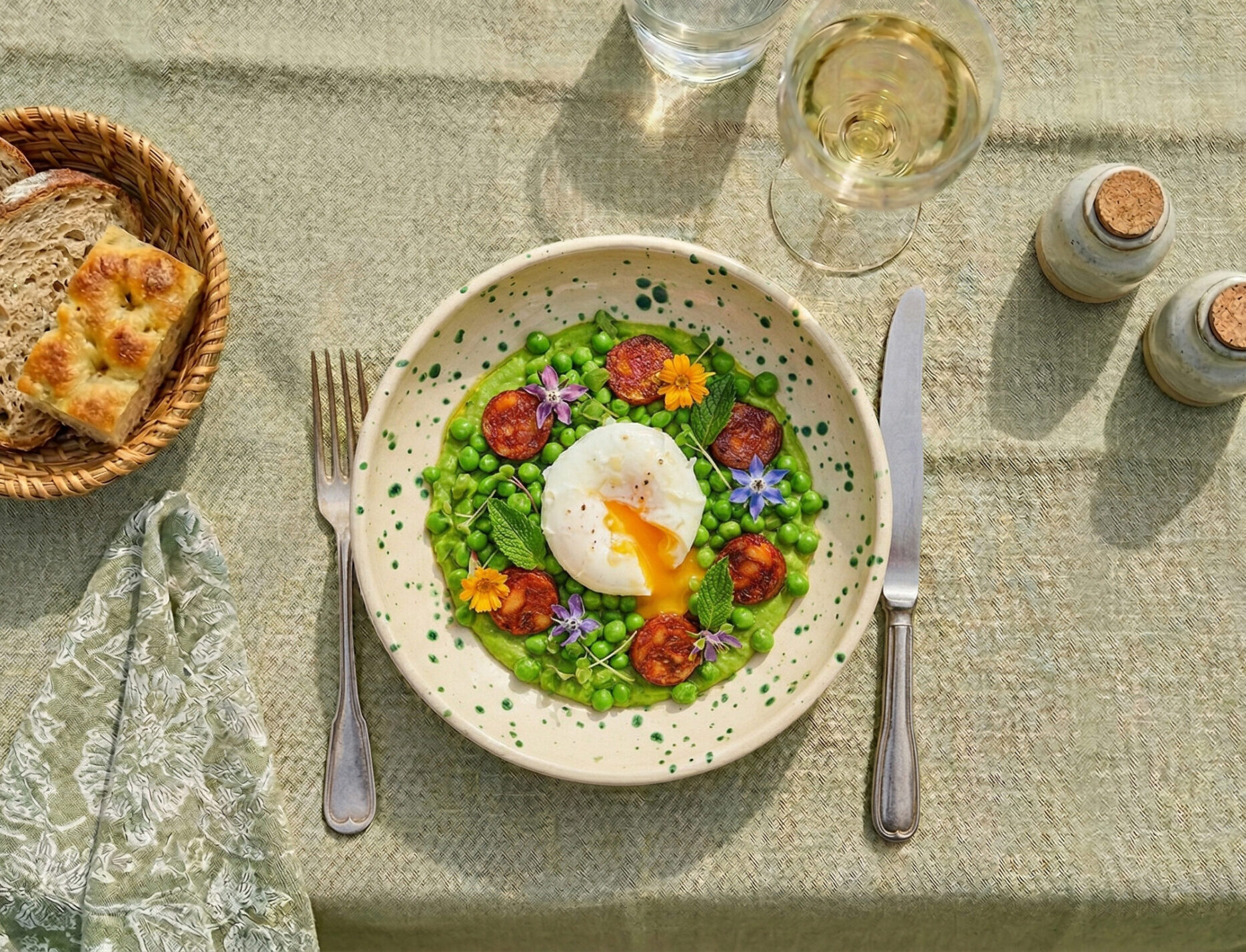 - Soft breaded egg with paprika, peas and parmesan mousse